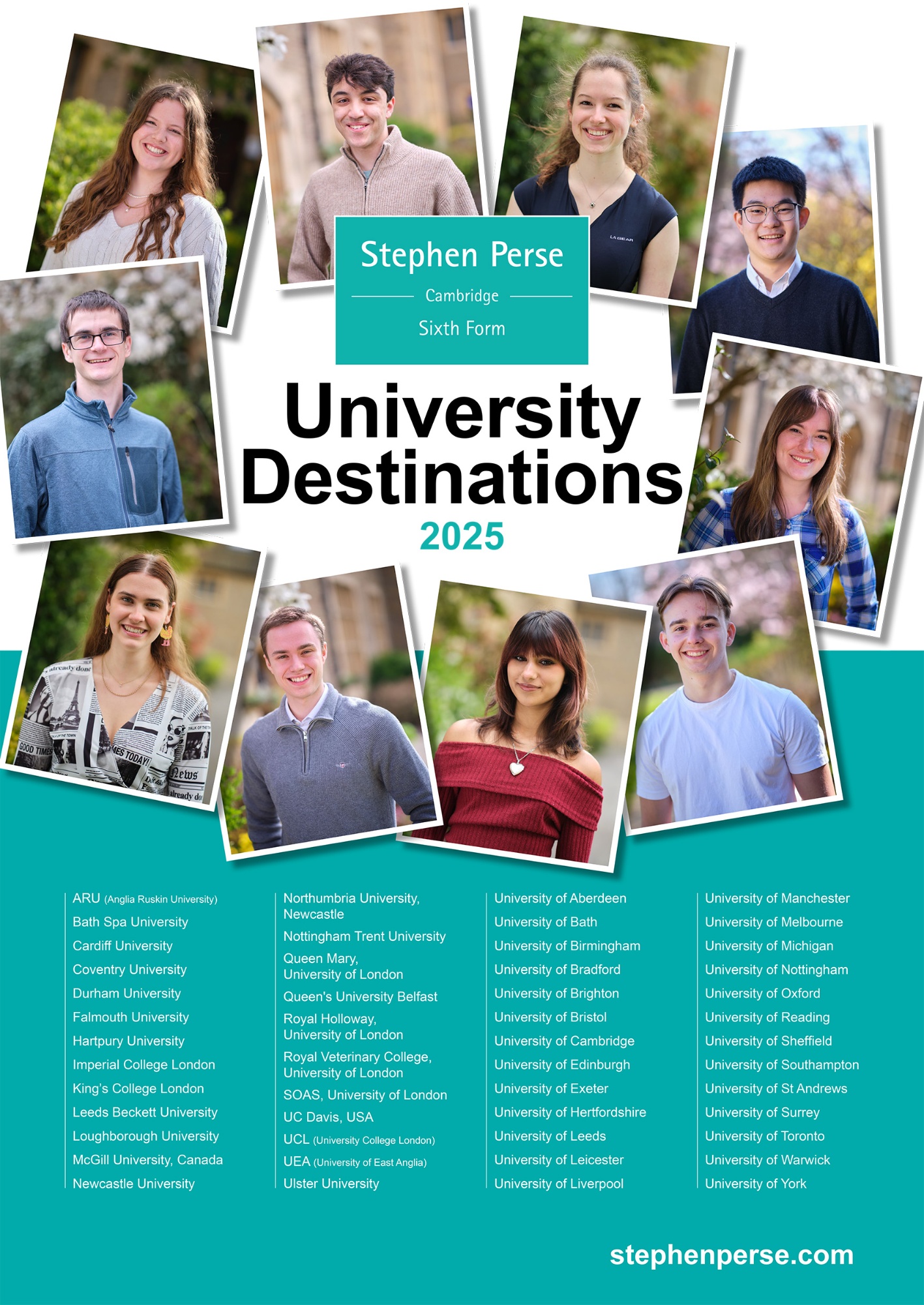 Over time we have carefully developed a guidance team with a broad range of expertise so that they are in a position to help students apply to a wide range of courses. We have particular success in Oxbridge (Oxford and Cambridge) applications – we are on track in 2026 to see success for well over half of the cohort who made applications this year. See our recent leavers' destinations and browse selected student profiles below for an insight into their experience of studying at Stephen Perse Cambridge:
